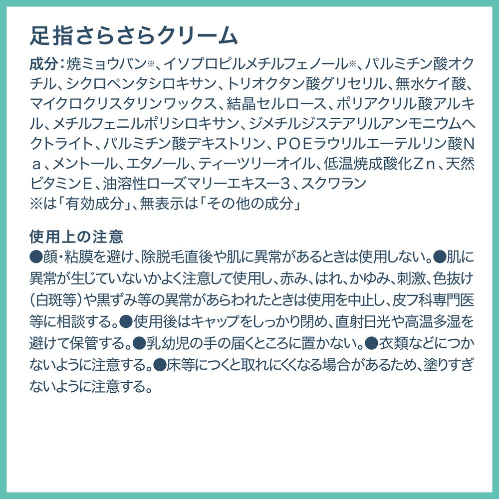 ●無香料、無着色。●ニオイの発生源の足指の間に、しっかりぬり込めるから、足特有のムレ、ニオイをしっかり防ぐ。