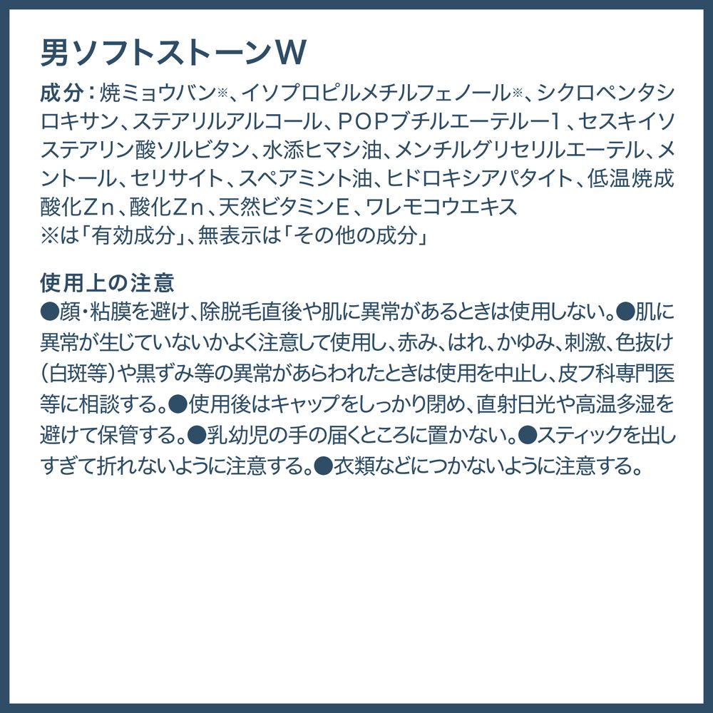 - 焼ミョウバン、イソプロピルメチルフェノール その他成分…シクロペンタシロキサン、ステアリルアルコール、POPブチルエーテ