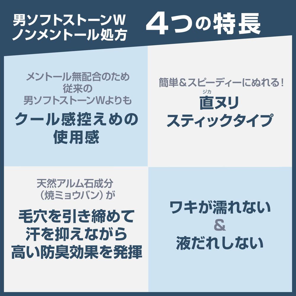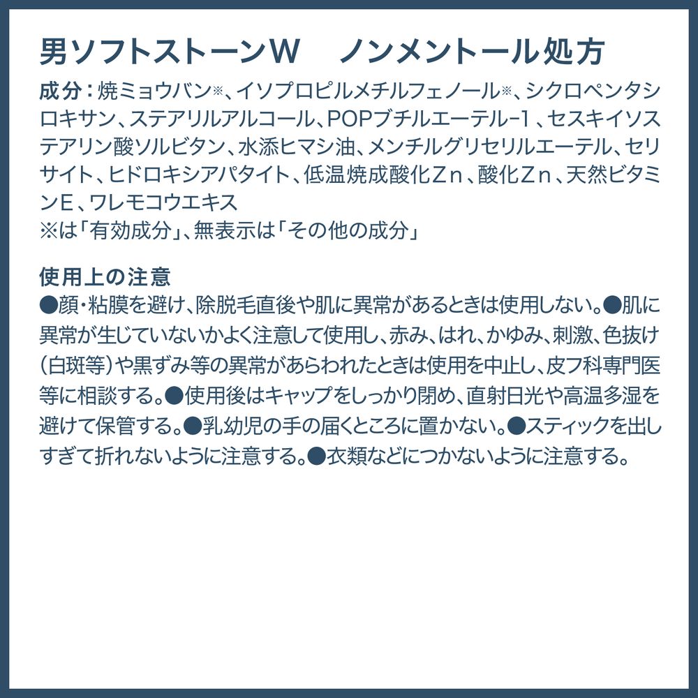 ●メントール無配合のため、従来の男ソフトストーンWよりもクール感控えめの使用感。