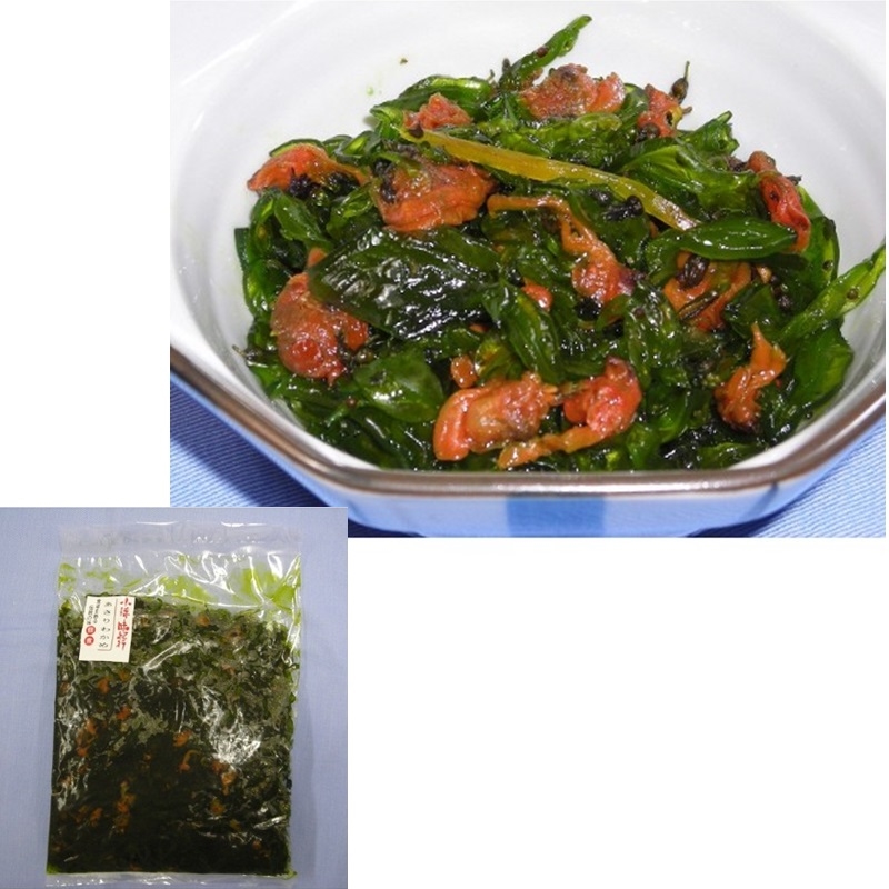 しそ風味で味付けした茎わかめと、甘しょっぱく味付けしたあさりを融合させました。