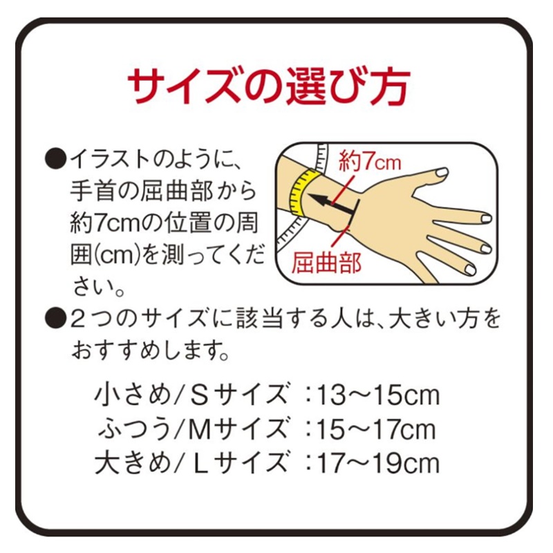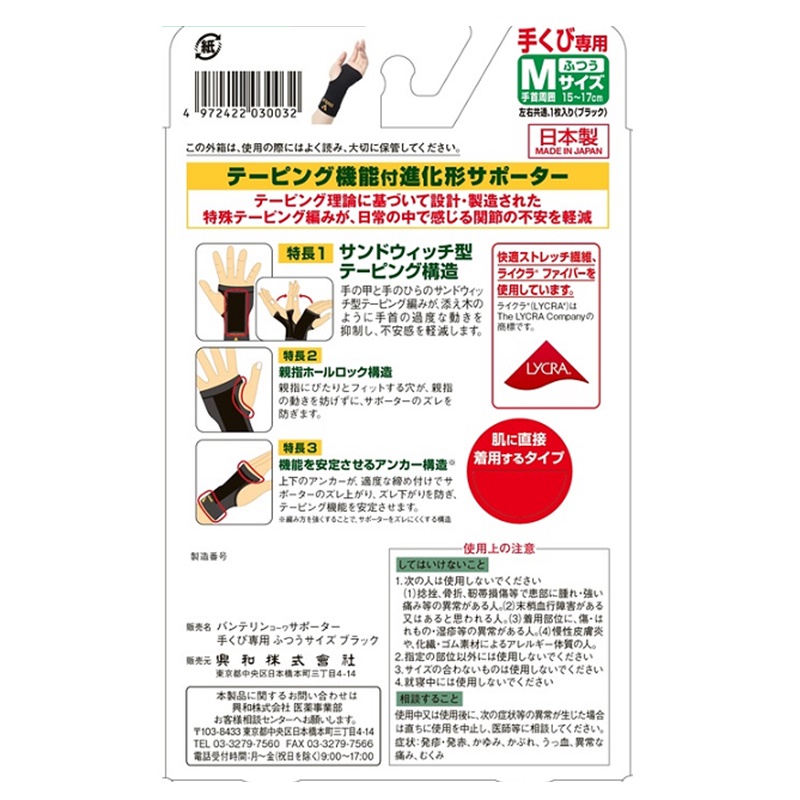 手の甲と手のひらのサンドウィッチ型テーピング編みが、添え木のように手首の過度な動きを抑制し、