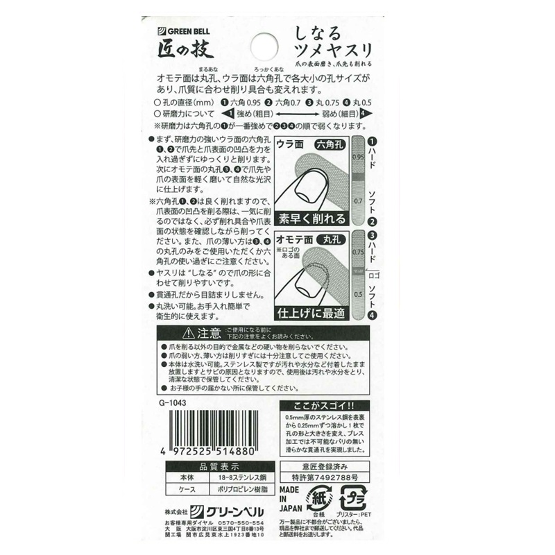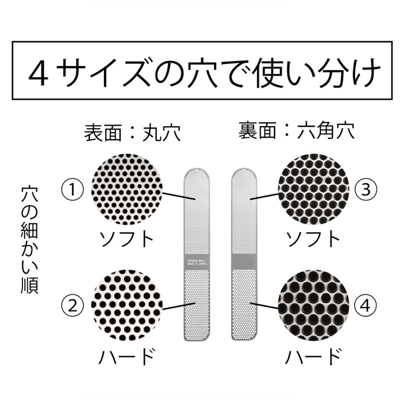 4つのサイズの穴で使い分けのできるツメヤスリです。