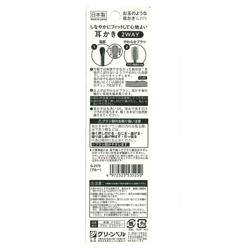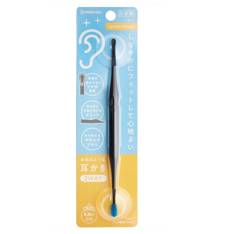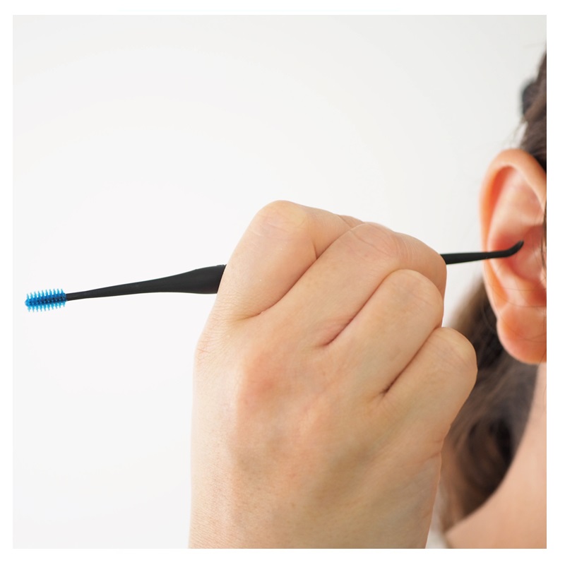 キャッチした耳垢をこぼしにくいフチ付き皿部と乾燥した細かい耳垢も絡めとるやわらかブラシの2WAYタイプの耳かきです。