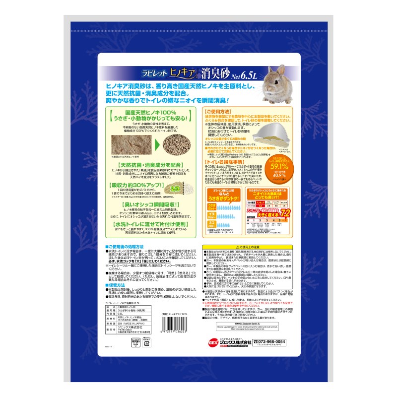 ・うさぎ・小動物の習性を考えて不純物のない国産天然ヒノキ原料を厳選した植物成分100%でつくられたトイレ砂です。