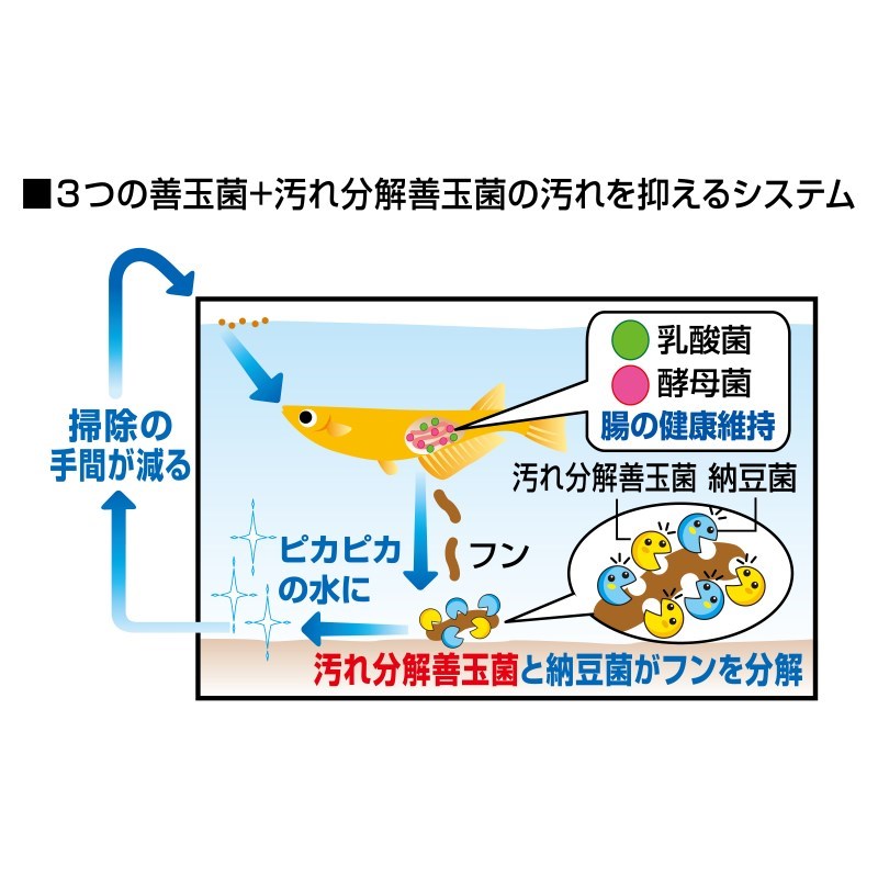 ●乳酸菌・酵母菌が健康な腸内環境を保ち、さらに納豆菌がフンや食べ残しを分解、水の汚れやニオイを押さえます。