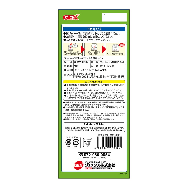 ・目詰まりしにくいマットの中に活性炭を配合したロカボーイ専用交換ろ過材のお徳用3個パックです。