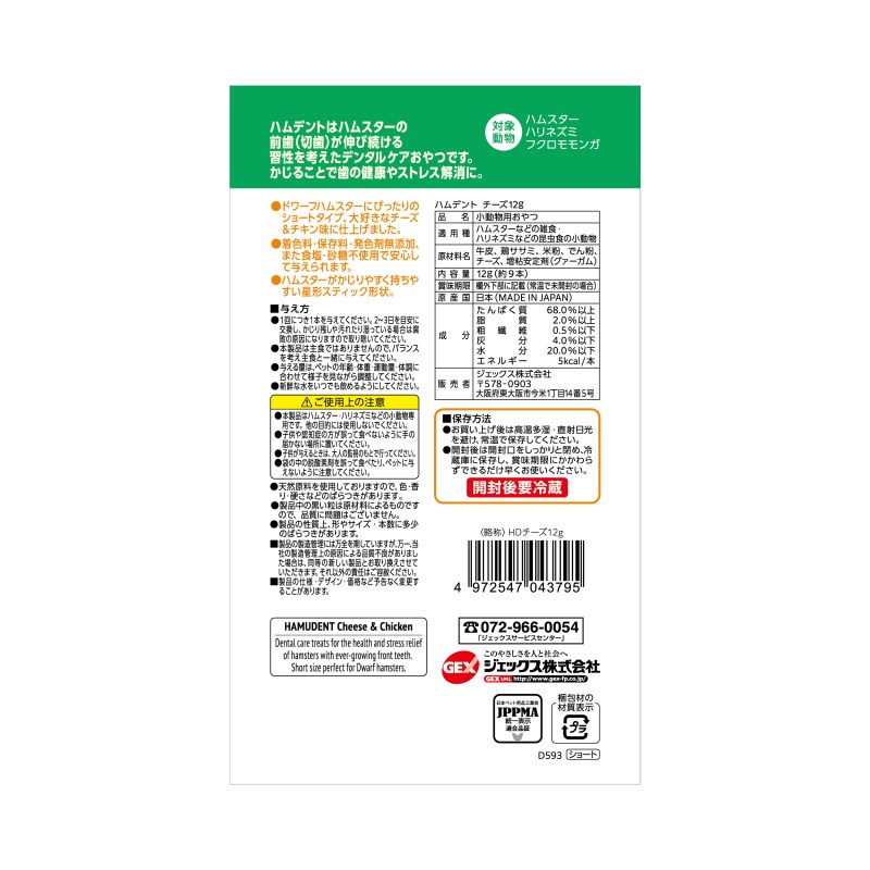 ・ドワーフハムスターにぴったりのショートタイプ、大好きなチーズ&チキン味に仕上げました。