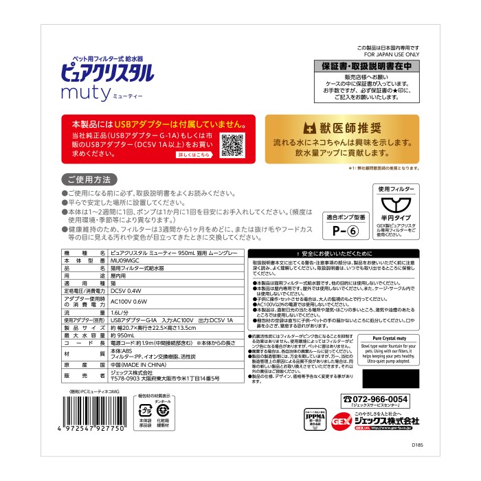 GEX ピュアクリスタルミューティー猫グレー950ml