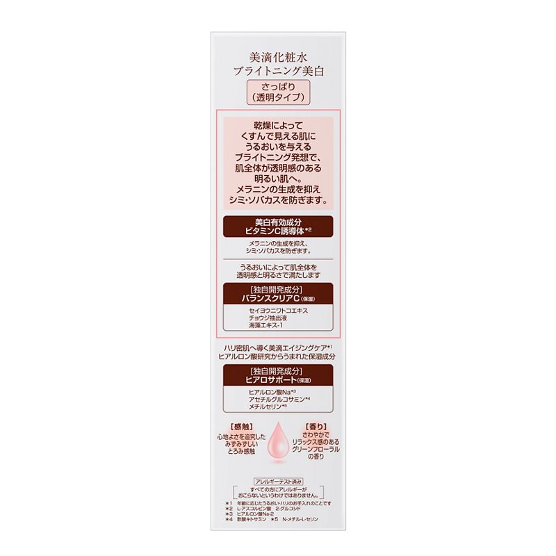 うるおって透明感のある肌へ導く美白化粧水。メラニンの生成を抑えシミ・ソバカスを防ぐ。(医薬部外品)