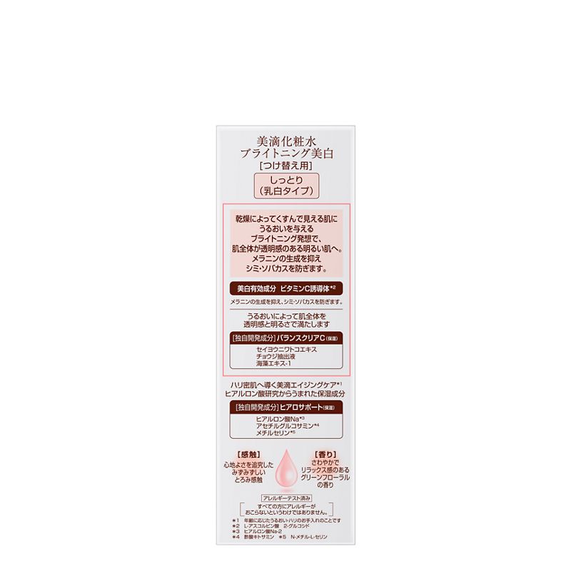 うるおって透明感のある肌へ導く美白化粧水。メラニンの生成を抑えシミ・ソバカスを防ぐ。(医薬部外品)