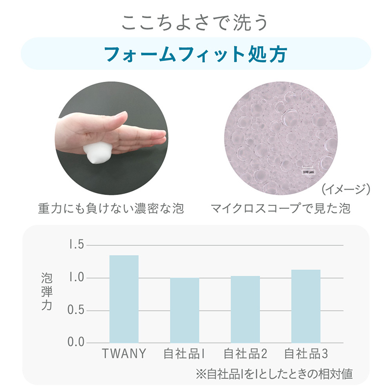 濃密泡がボディの凹凸にもぴったりフィットし、においやべたつきのもとになる汚れもうるおいを守りながら洗い落とす。