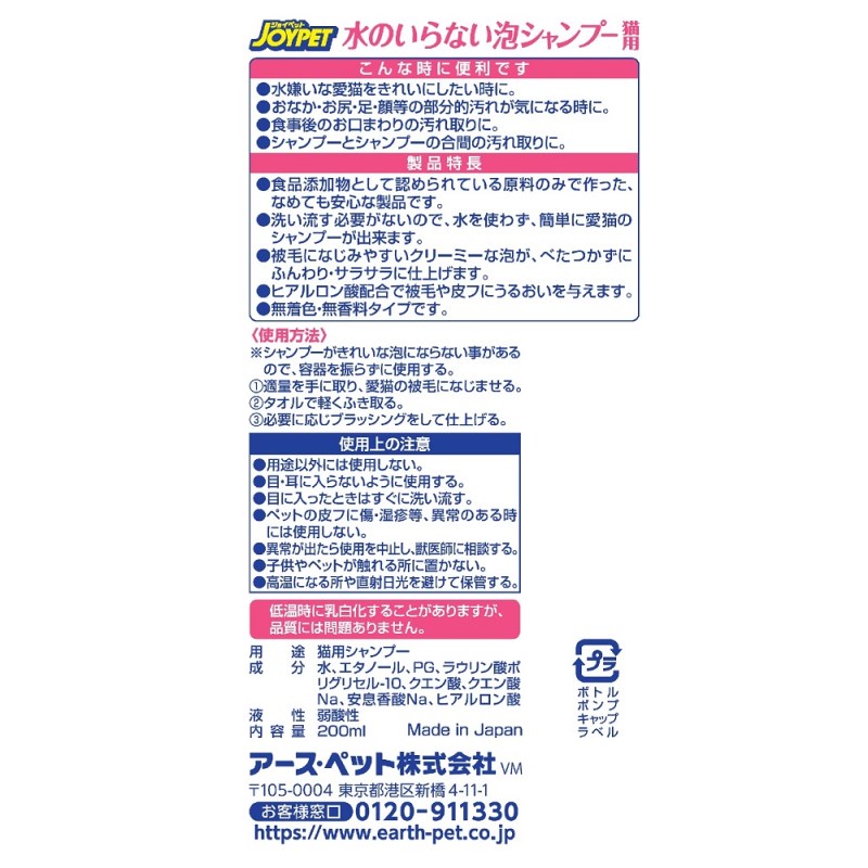 ・無着色、無香料で洗い流す必要がないので、水を使わず、簡単に愛猫のシャンプーが出来ます。