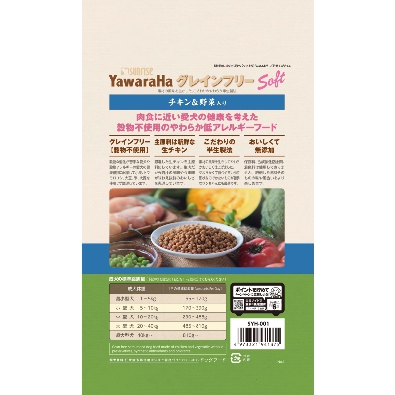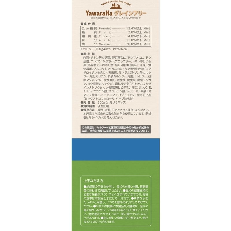 いも類(馬鈴薯でん粉等)、魚介類、油脂類(亜麻仁油等)、食物繊維、グルコサミン(カニ由来)、サメ軟骨抽出物