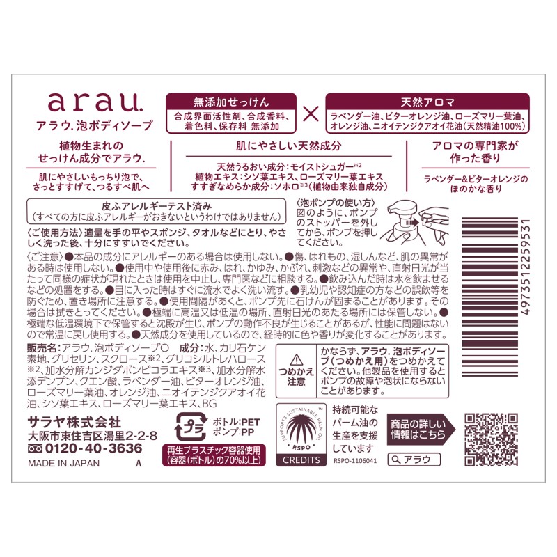 ン、クエン酸、ラベンダー油、ビターオレンジ油、ローズマリー葉油、オレンジ油、ニオイテンジクアオイ花油、シソ葉エキス、ロー