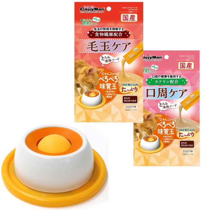 - 本体:ポリプロピレン、エラストマー/にゃんこの健康ピューレ口周ケア:鶏肉(胸肉、チキンパウダー)、調味料