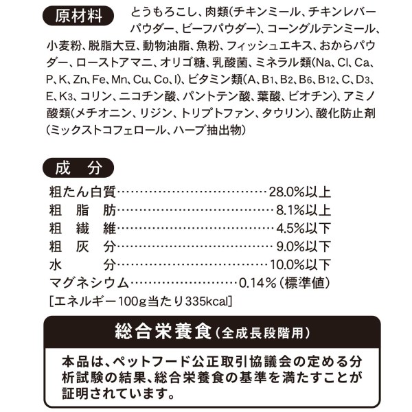 - とうもろこし、肉類(チキンミール、チキンレバーパウダー、ビーフパウダー)、コーングルテンミール、小麦粉、脱脂大豆