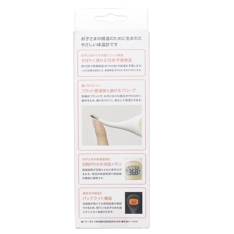 わきの下のカーブに沿うようにしなやかに曲がり、わきに優しくフィットするので、赤ちゃんの検温も安心してお使いいただけます。