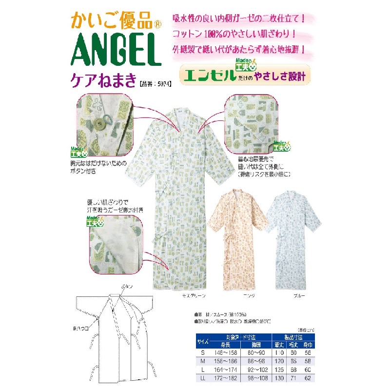 胸元がはだけない内側大きめボタン付き。袖通しがらくなラグラン袖。丸洗い、乾燥機にも対応しております。