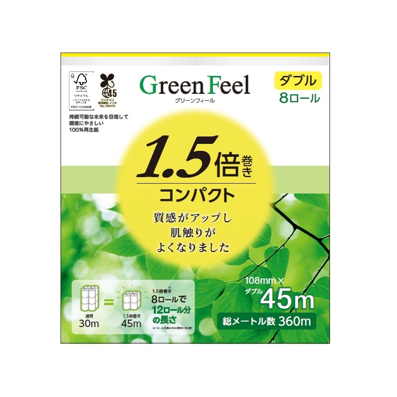 グリーンフィール1.5倍巻8ロールダブルは、1ロールの長さ45mのコンパクト長持ちトイレットペーパーです。