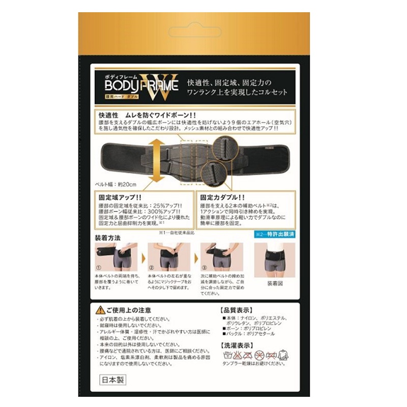 前部・後部のメッシュと2本のワイド弾性ボーンで腰部を保護固定します。(ボーン幅従来比・300%UP!)