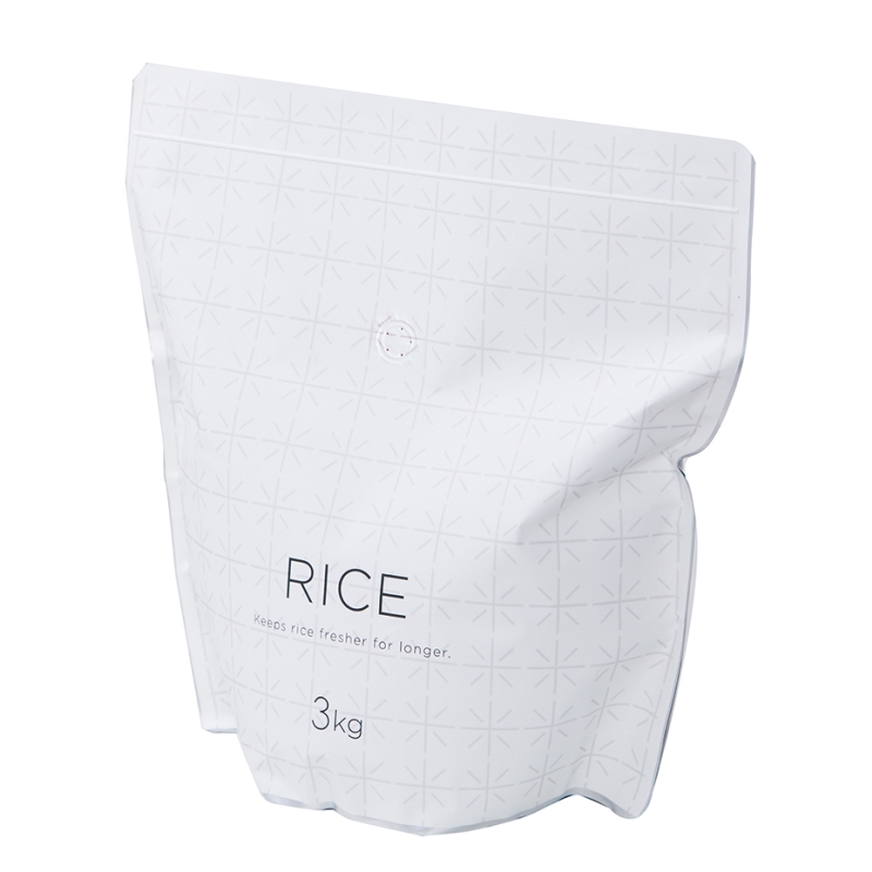 お米の量に合わせて省スペースに収納でき、マチ付きで立つ。
