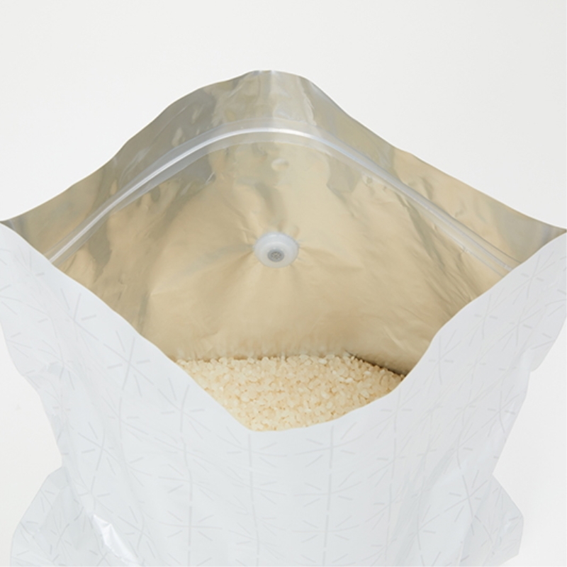 袋中の空気を抜く逆止弁付き、お米が酸化しにくい。