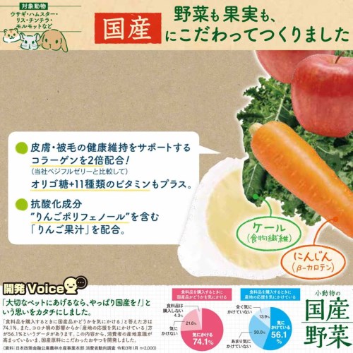 国産野菜(にんじん、ケール)と国産果実(りんご)を使用したぷるっと食感のゼリー。皮膚・被毛の健康維持をサポートするコラー