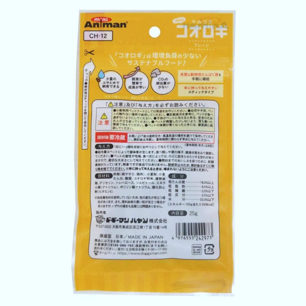 ・鶏ささみ生地にコオロギ粉末が入った、与えやすいスティックタイプのジャーキーおやつです。