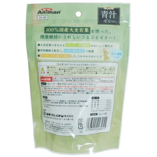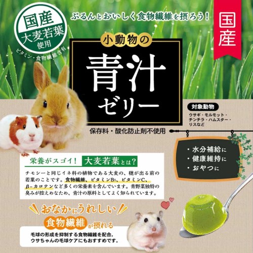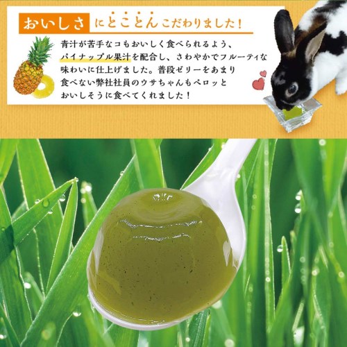 国産大麦若葉を使用した小動物用の青汁ゼリー。お腹の健康維持をサポートする食物繊維配合。パイナップル果汁入り。
