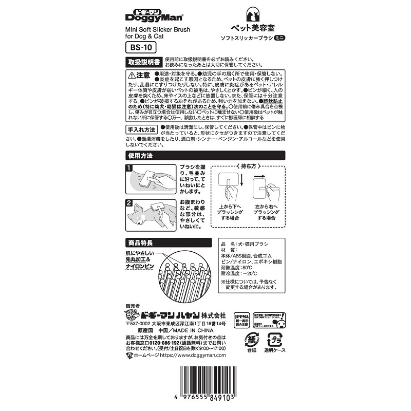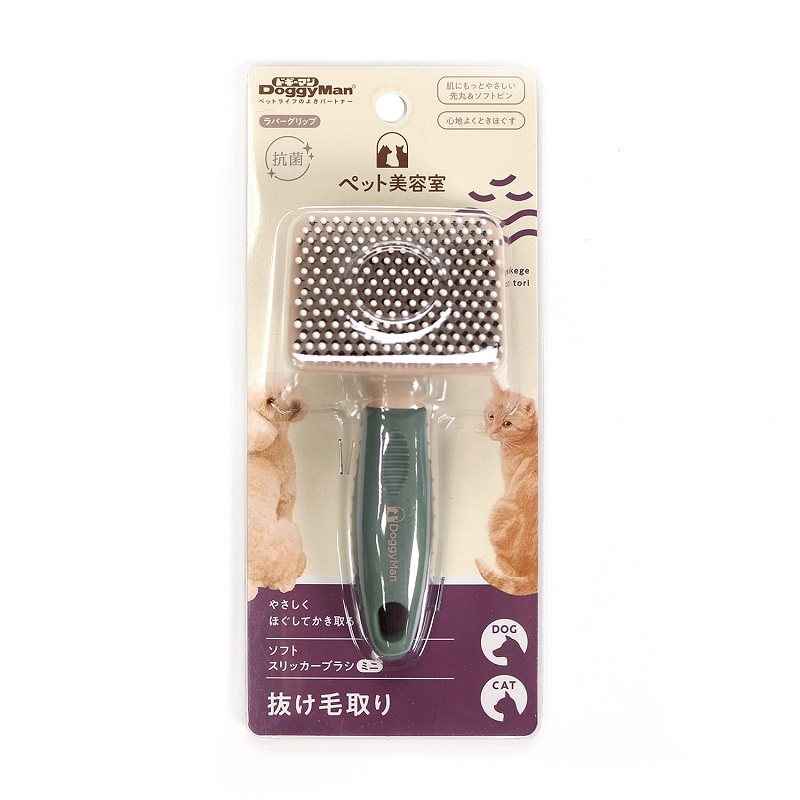 肌にやさしい先丸&ソフトピンの抜け毛取りブラシ。ピンはナイロン製で適度な弾力性があり肌あたりがやさしい。