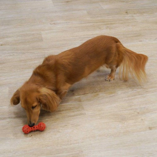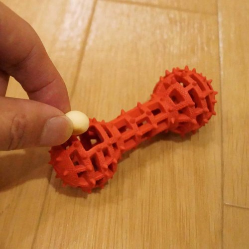 アミ目のすき間から中におやつを入れてトリーツ玩具としても楽しめる。天然ゴムを使用した安全素材で製造。