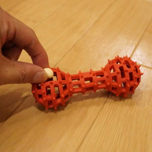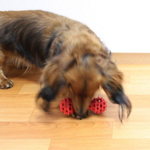 な愛犬でもくわえやすい形状。 ・アミ目のすき間から中におやつを入れてトリーツ玩具としても楽しめる。・真ん中をくわえたり、