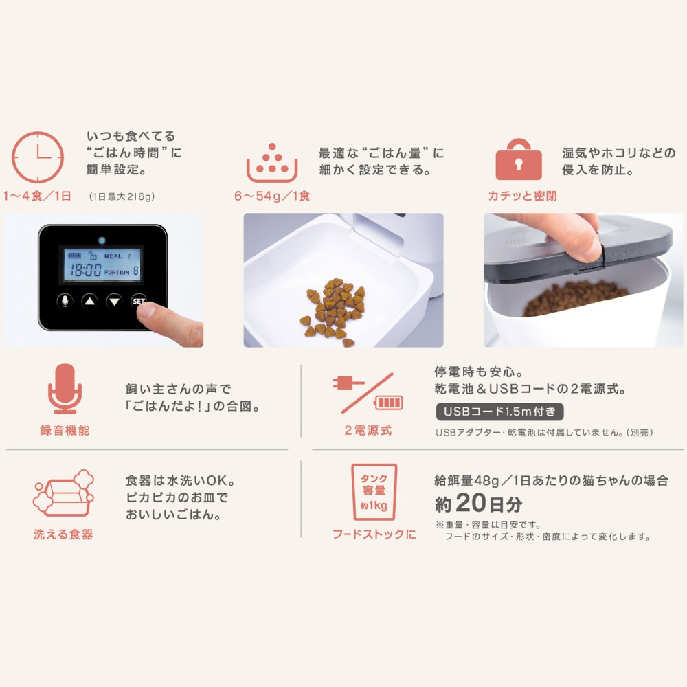 ・録音機能つき。飼い主さんの声で「ごはんだよ!」とお知らせできます。