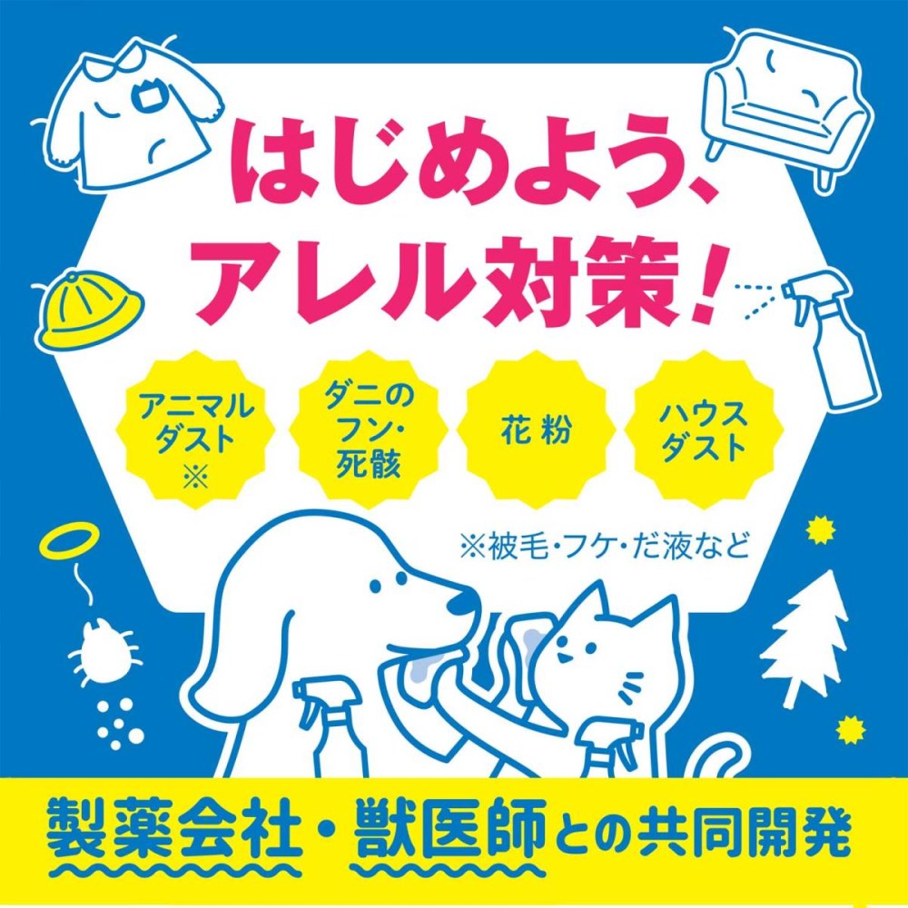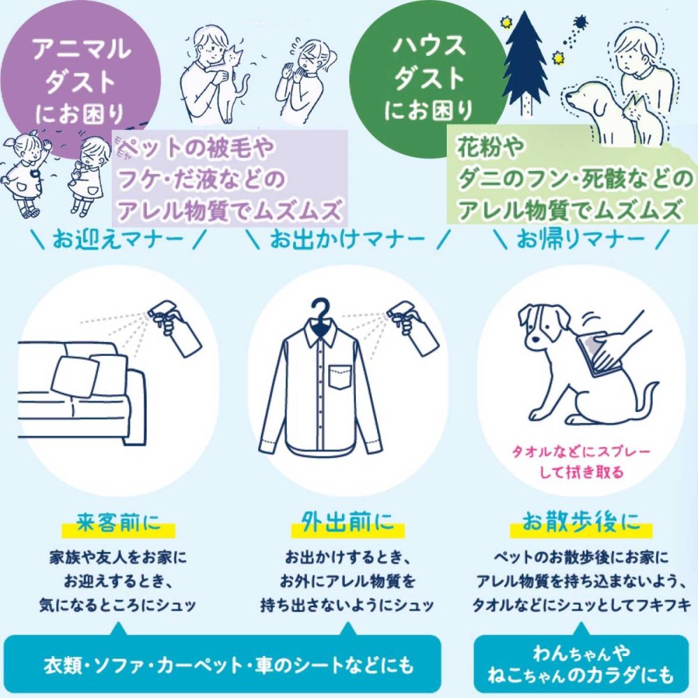 ・花粉・ダニのフン・死骸・ハウスダスト・アニマルダスト(被毛・フケ・だ液など)に効果があるアレル対策スプレーです。