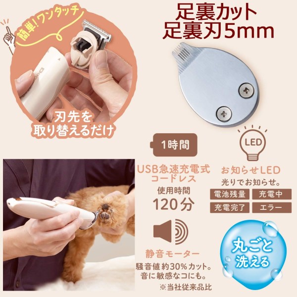 ・刃も本体もまるごと洗えて、簡単にお手入れ可能なUSB急速充電式コードレスバリカンです。