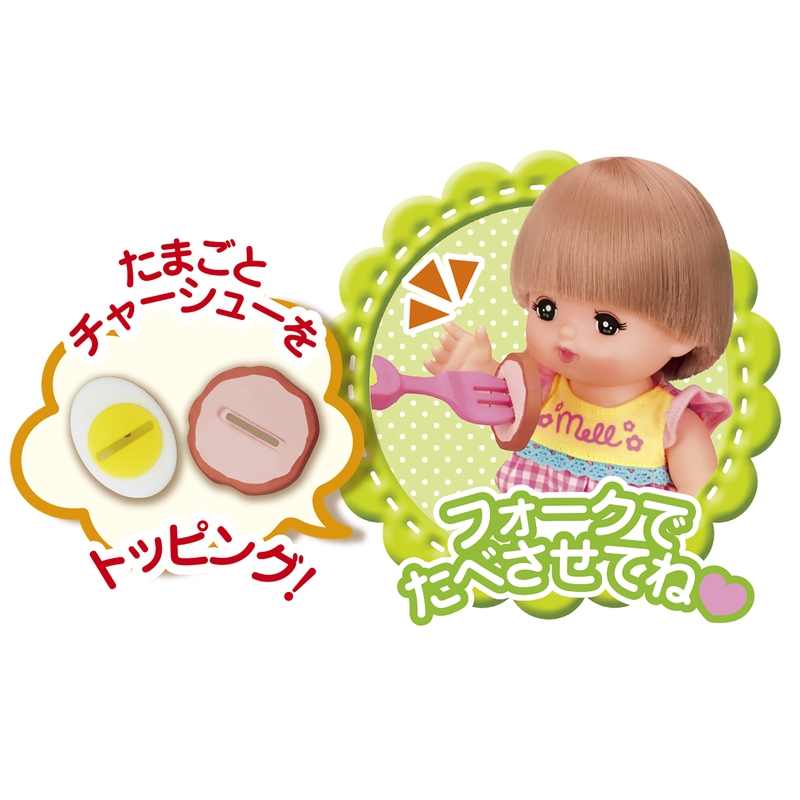 ・トッピングした、たまごやチャーシューもメルちゃんに食べさせてあげられます。