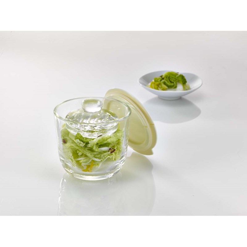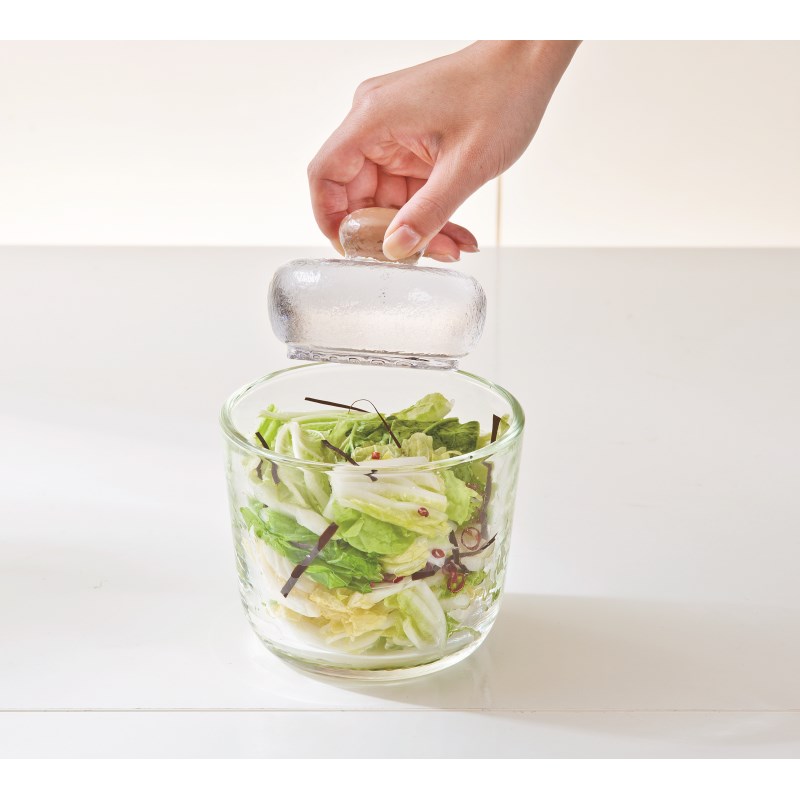 透明でシンプルなデザインなので、野菜の彩りが見えそのまま食卓に置いても様になるガラスの一夜漬け器です。