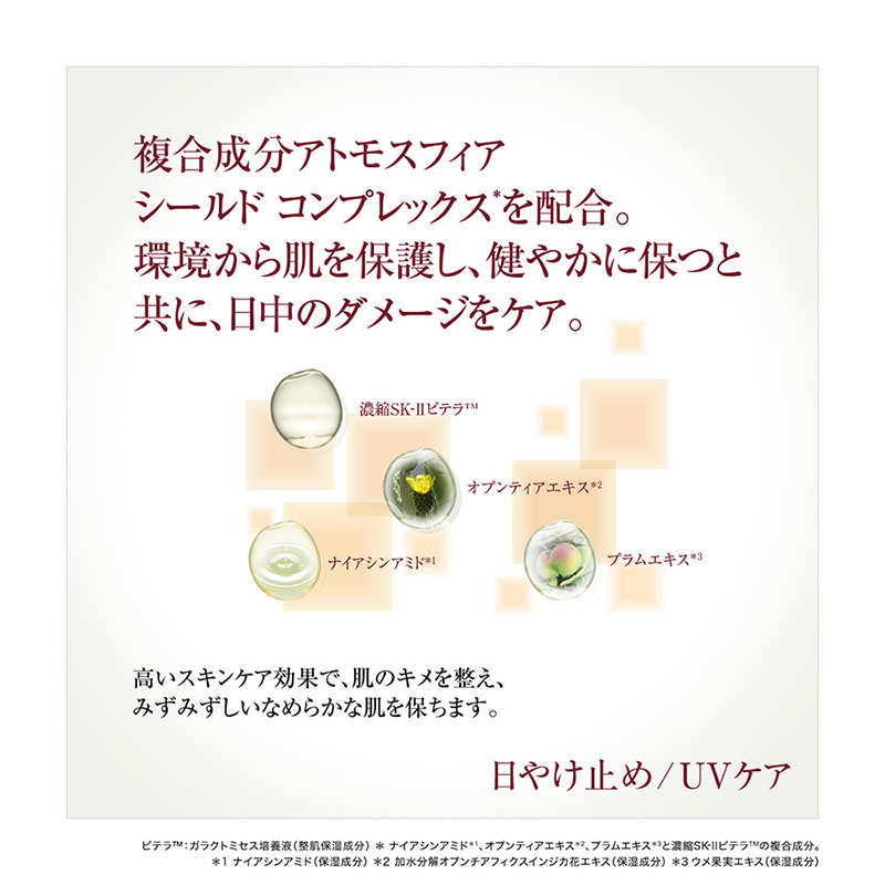 濃縮SKーIIピテラTMを含む新複合成分配合。日中の紫外線、IR、大気汚染から肌を保護し、肌を健やかに保つと共に、