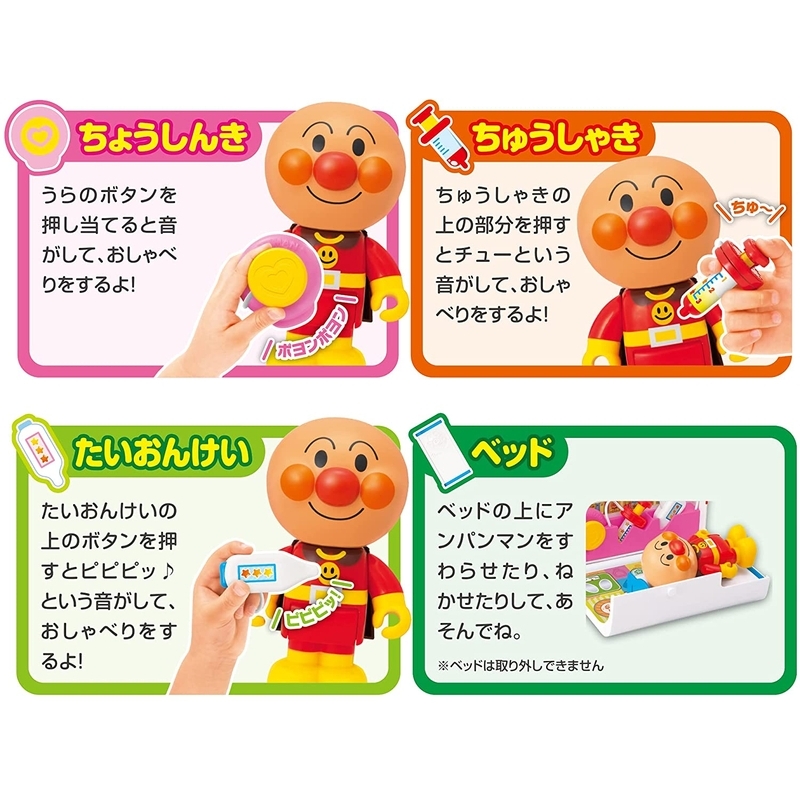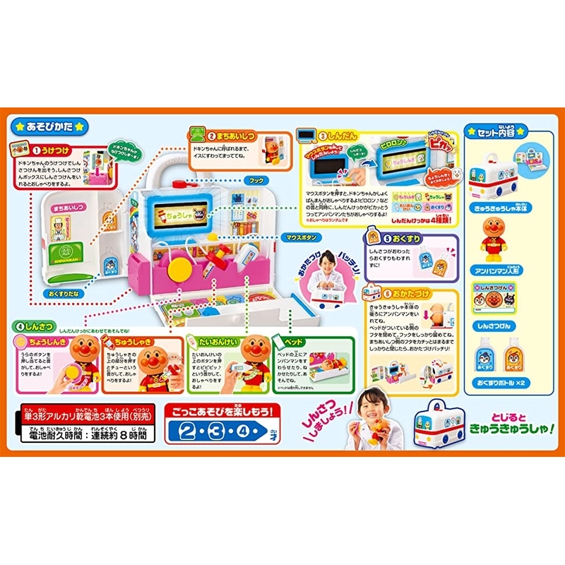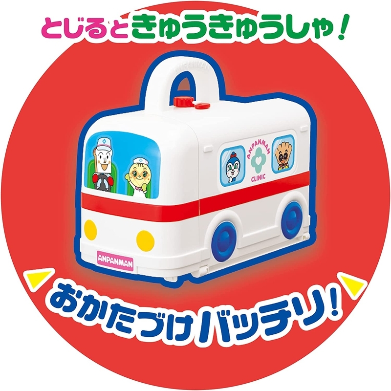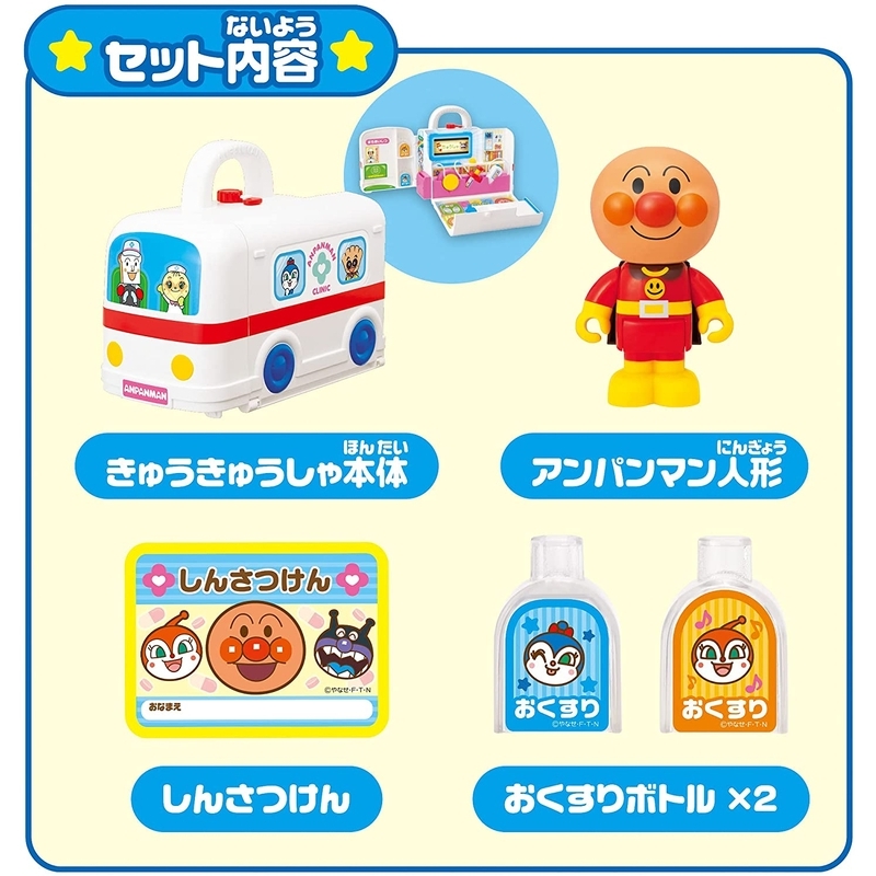 ・きゅうきゅうしゃ本体、しんさつけん、おくすりボトル×2、アンパンマン人形