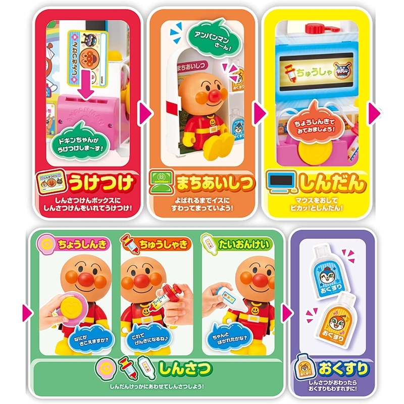 お子様自身の経験と同じようにアンパンマン人形におくすりを処方したり