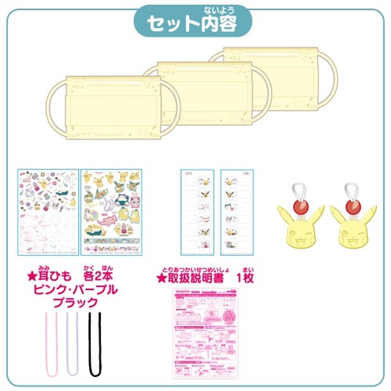 ・カラーマスク3枚、耳ひも6本(ピンク、パープル、ブラック各2)、
