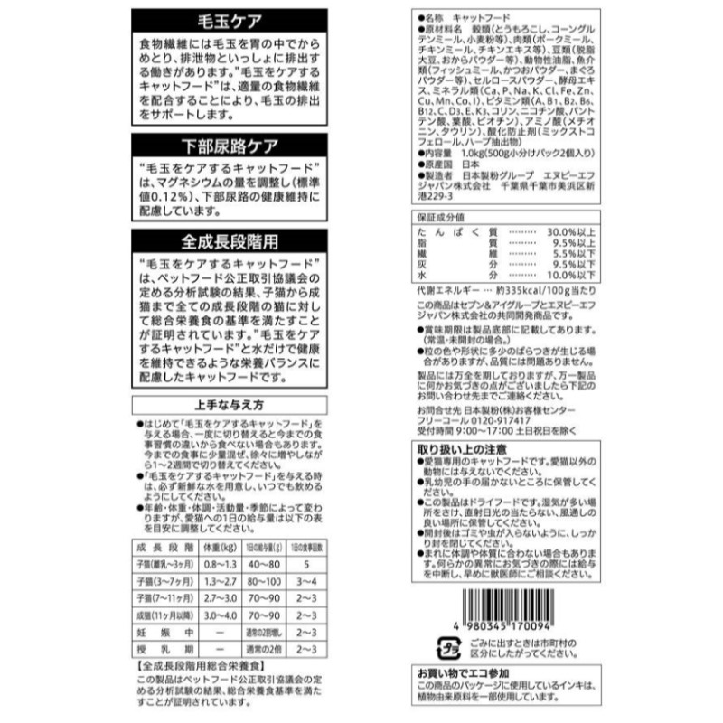 あらゆる年齢の猫ちゃんのための総合栄養食。適量の食物繊維を含み、飲み込んでしまった毛玉の排出をサポート。