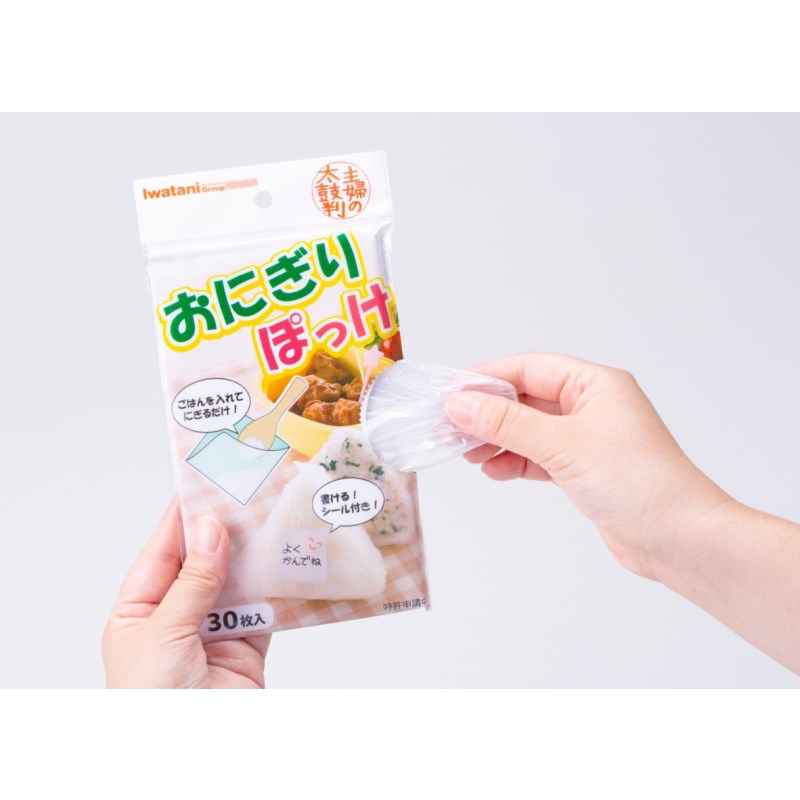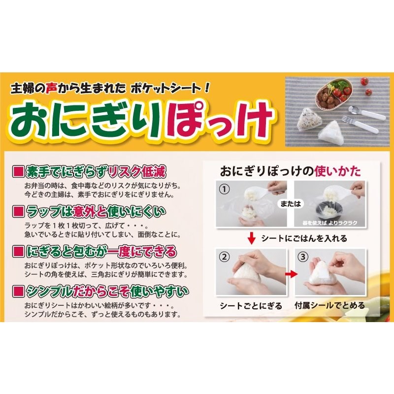 ポケット形状で、シートの角を使えば三角おにぎりが簡単にでき、にぎると包むが一度にできます。