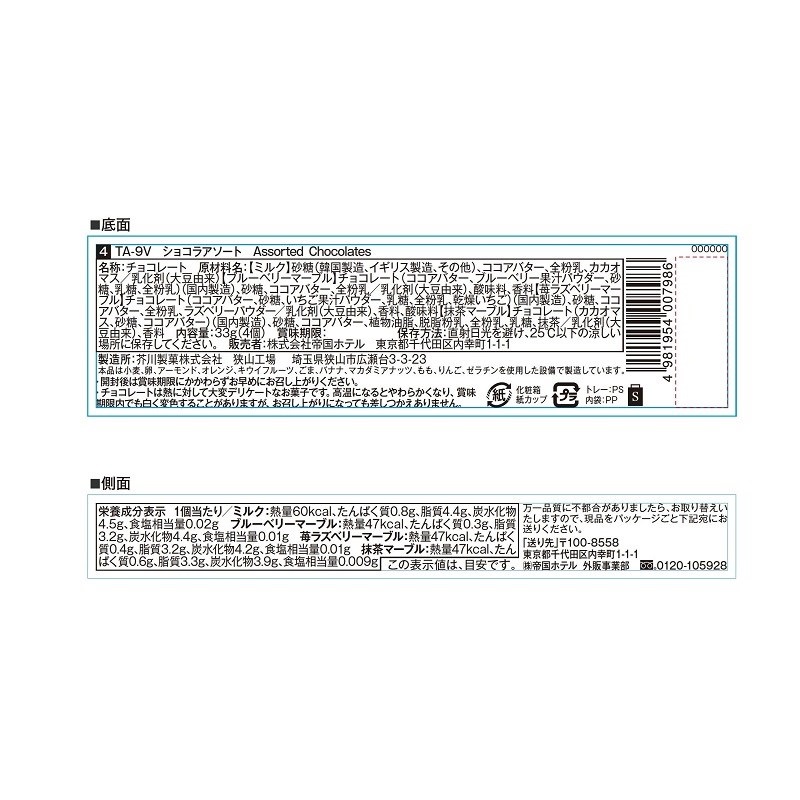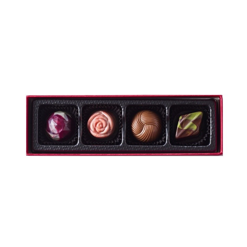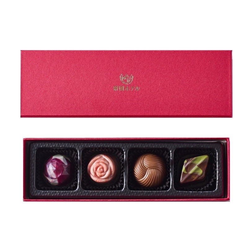 カラーボックスに帝国ホテルのロゴを箔押しし、4種の粒チョコレートを詰合わせました。