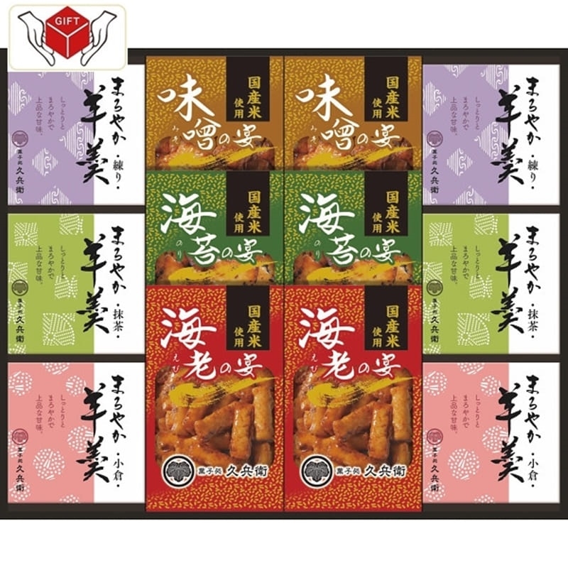 ●あられ(海老・海苔・味噌)各12g×各2、羊かん(抹茶・練り・小倉)各60g×各2