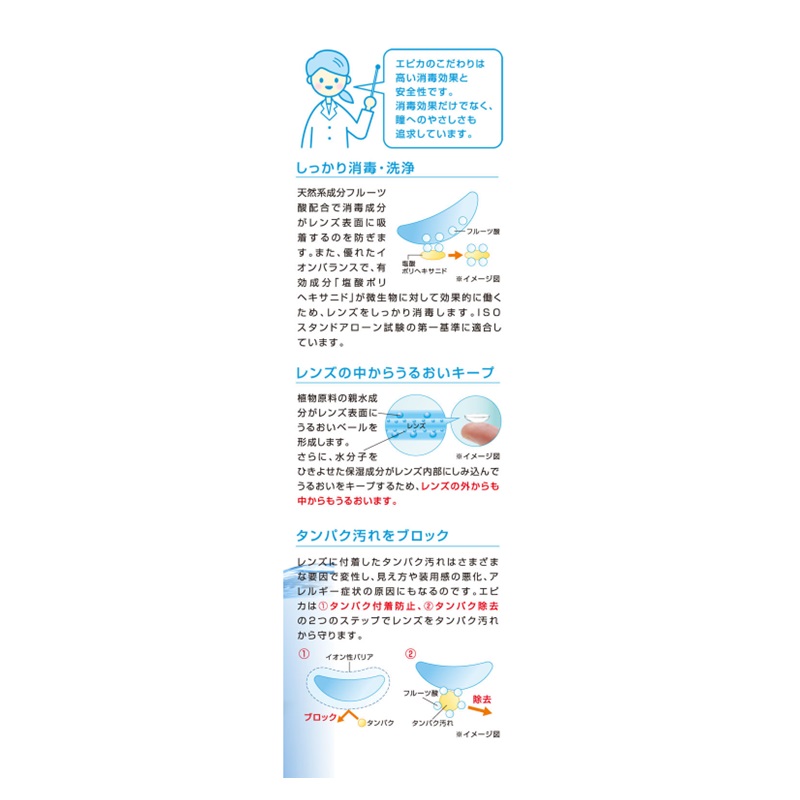 しっかり消毒・洗浄有効成分塩酸ポリヘキサニドと植物原料の界面活性剤のはたらきにより、レンズをやさしく、