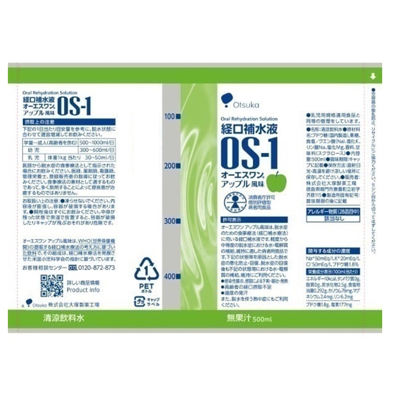 オーエスワンアップル風味は、脱水症のための食事療法(経口補水療法)に用いる経口補水液です。