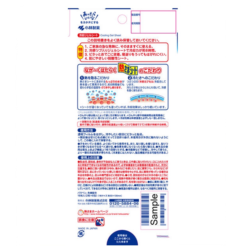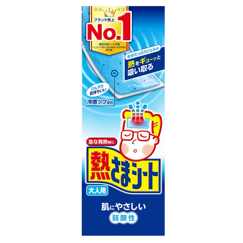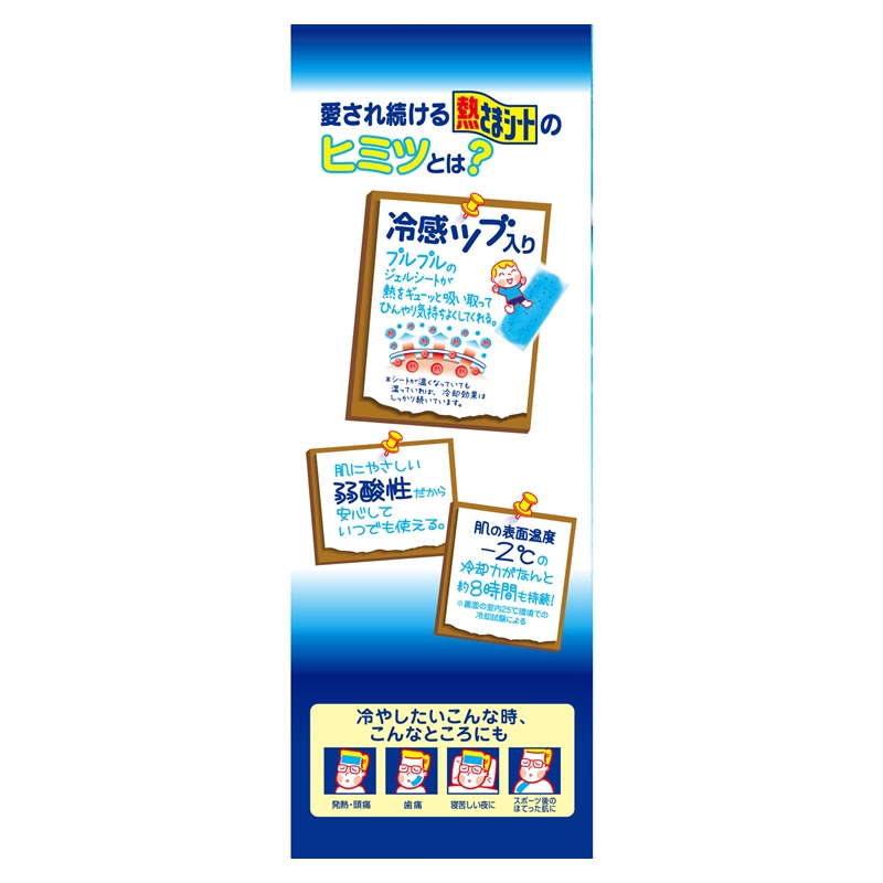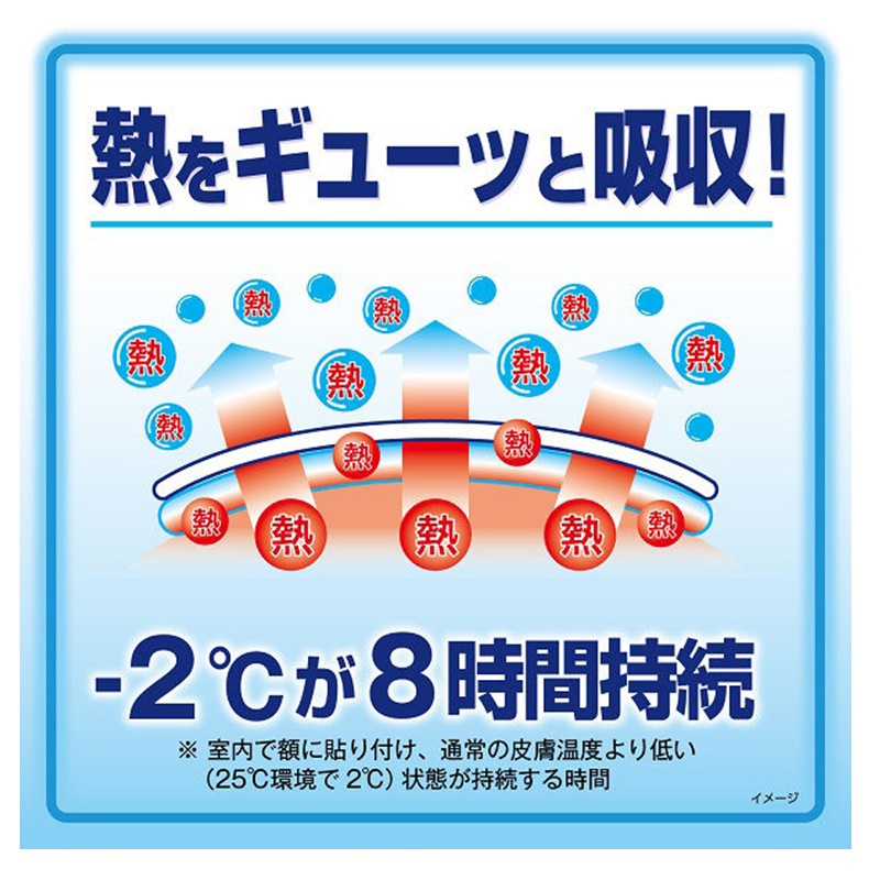 熱を取るこだわり=熱さまシートに含まれるたっぷりの水分が熱を吸って蒸発するので約8時間後でも変わらず肌の温度を-2℃冷や