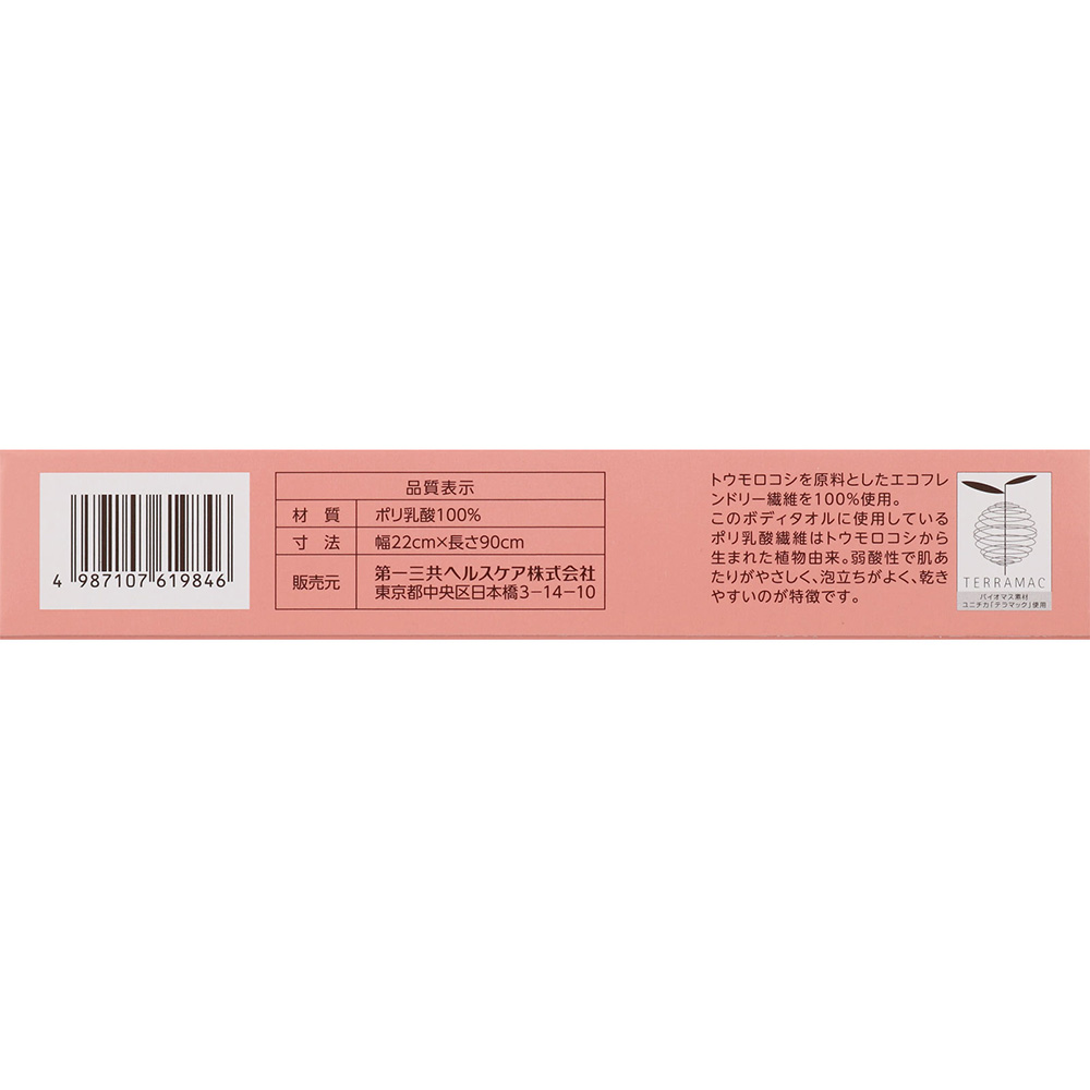 このボディタオルに使用しているポリ乳酸繊維はトウモロコシから生まれた植物由来。弱酸性で肌あたりがやさしく、泡立ちがよく、