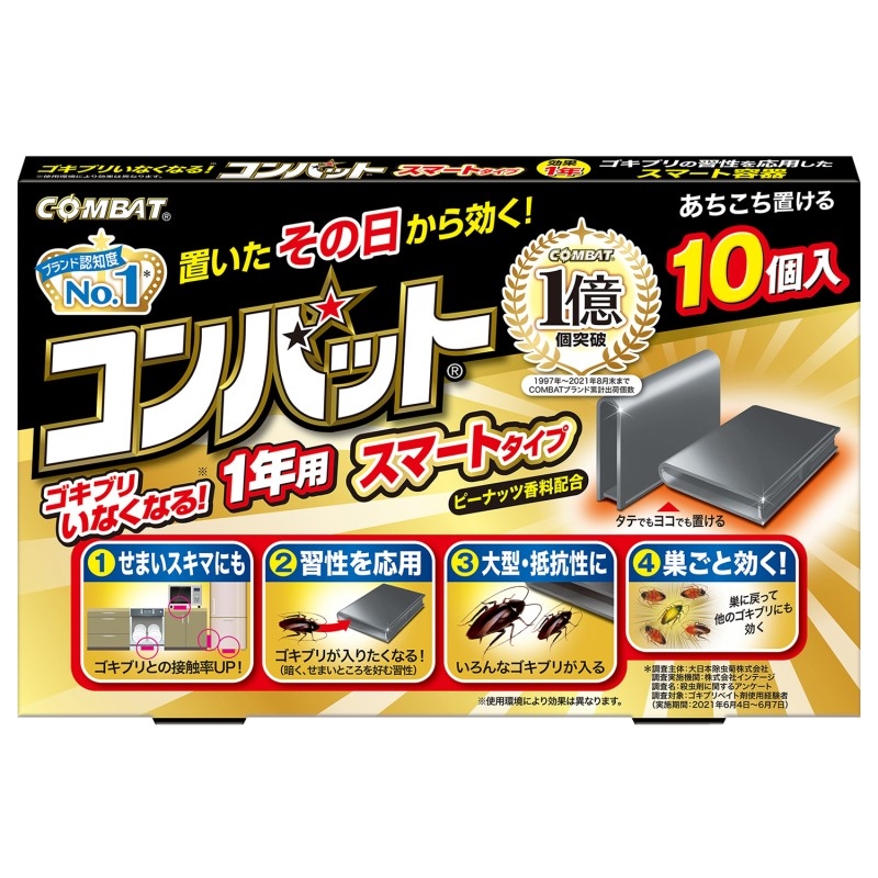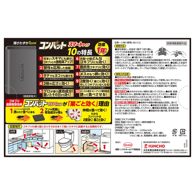 ●10の特長…(1)せまいスキマにも置け、ゴキブリとの接触率アップ。(2)習性を応用した容器。ゴキブリが入りたくなる形状